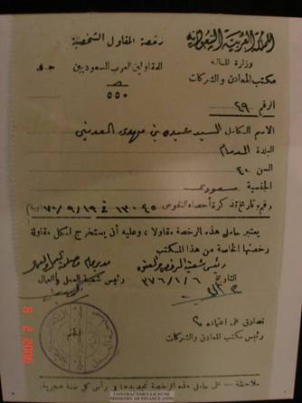 وتبين الصورة توقيع للعم عبد العزيز على رخصة المقاول الشخصية لمكتب المعادن والشركات التابع لوزارة المالية تعود لتاريخ 6-1-1376هـ جميع الحقوق محفوظة © ، أضغط هنا للإطلاع على إتفاقية إستخدام الموقع |
